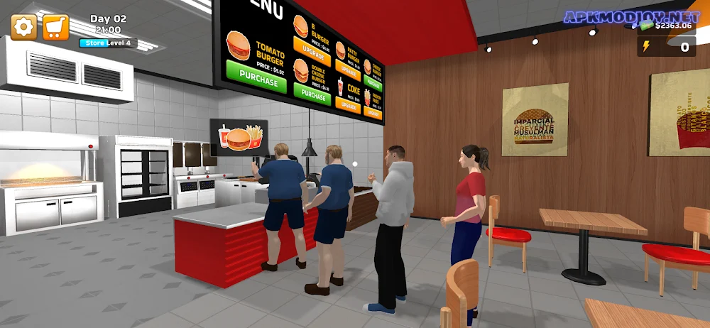 - Opsi Kustomisasi: Sesuaikan tata letak restoran, peralatan dapur, dan resep burger agar sesuai dengan gaya bermain pilihan Anda.